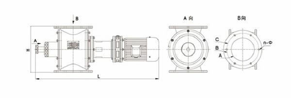 型號 | A | B | C | H | L | n-φ | 工作溫度 ℃ | 轉速r/min | 電機功率 kw |